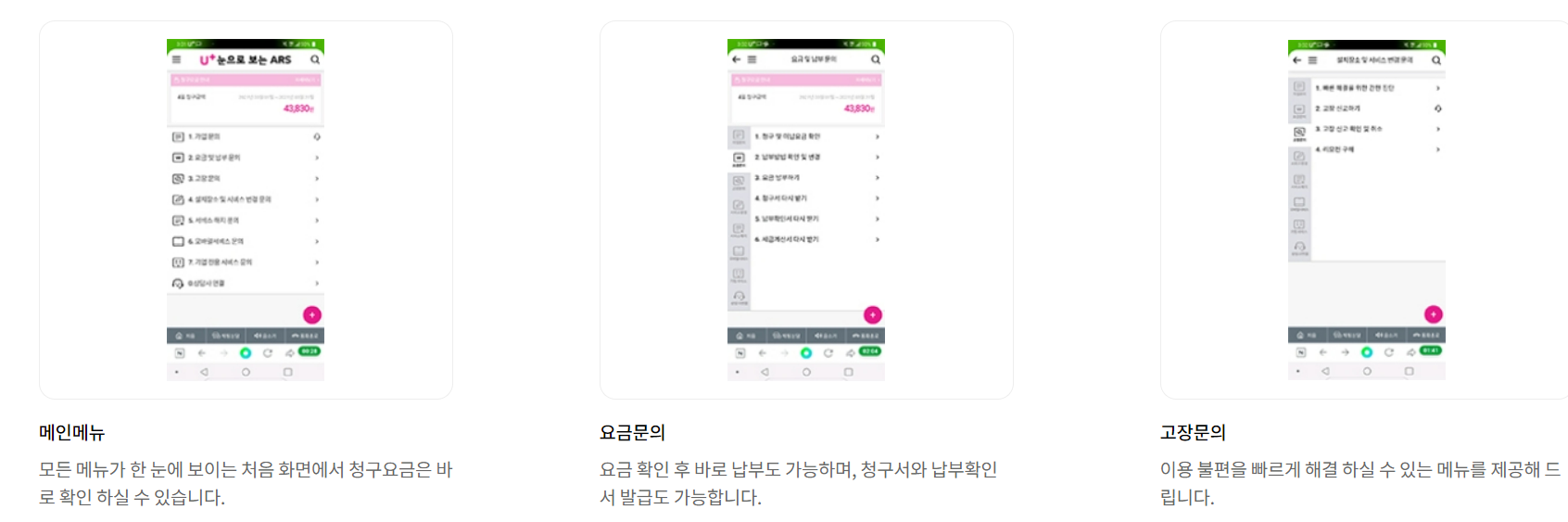 눈으로 보는 ARS의 경우 화면을 보면서 이용할 수 있어 편리한 서비스입니다. 해당 서비스는 ARS 음성안내를 끝까지 듣지 않아도 상담원과 빠르게 연결이 가능하며, 원하는 메뉴를 쉽고 빠르게 찾아 직접 처리할 수 있는 다양한 메뉴가 있습니다. 또한 상담원이 근무하지 않는 시간에도 조회 및 처리 가능한 메뉴들이 있어 사용자가 편리하게 이용할 수 있습니다.